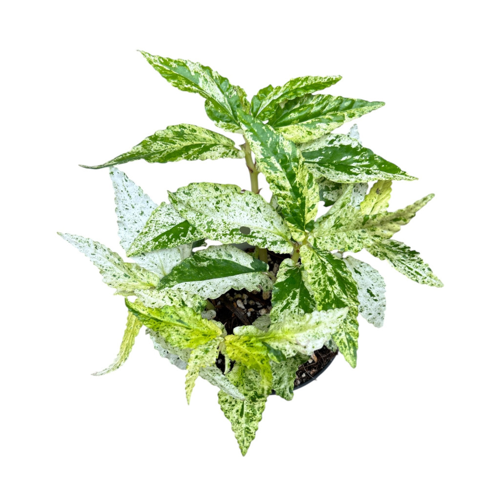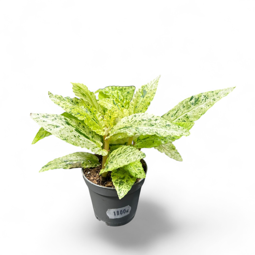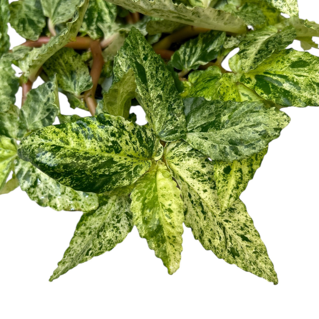 Leírás: Délkelet-Ázsiából származó kis termetű, trópusi talajtakaró kúszónövény; levelei fiatal korban oválisak, majd később hosszúkásak; húsos szára vörös színű; a levéllemez alapszíne krémszínű, rajta ksiebb-nagyobb zöld pöttyök találhatók (fényszegény környezetben a levéllemezt nagyobb arányban borítják zöld foltok); a fonák színe megegyezik a levéllemez színével; leveleinek széle fűrészes; kiváló terráriumi/floráriumi- (jól viseli a visszacsípést) és ámpolnanövény; ritkán virágzik (virágzatát apró, sárgás-zöld színű virágok alkotják); terráriumban/floráriumban képes bizonyos magasságig felkúszni a hátfalra/dekorációra; könnyen tartható, gyors növekedésű 'szobanövény'